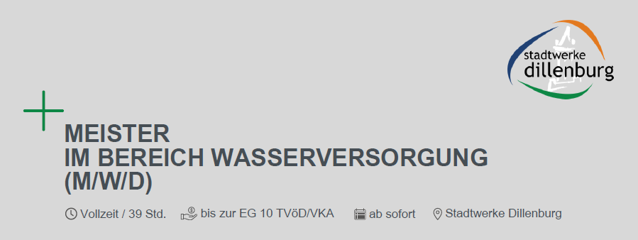 Bei den Stadtwerken Dillenburg ist ab sofort eine Stelle als Meister im Bereich der Wasserversorgung...